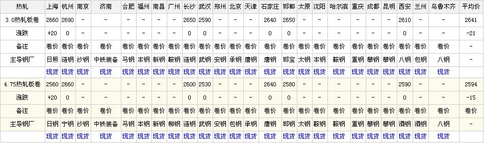 | 4.75熱軋板卷 | 2560 | 2660 | - | - | - | - | - | - | 2600 | 2530 | - | - | - | 2640 | 2580 | - | - | - | - | - | - | 2590 | - | - | 2594 |